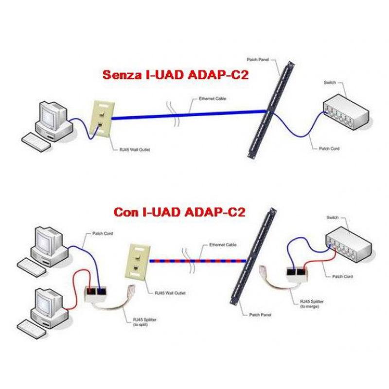 Questo moltiplicatore di porte Lan e telefoniche ISDN consente di risparmiate sui costi di installazione e cablaggio dei cavi LAN e ISDN collegando due linee su un solo cavo a 8 fili. Questo sdoppiatore utilizza le due coppie di conduttori normalmente non utilizzate, consentendo di effettuate due connessioni su di un'unica linea Lan o ISDN. In questo modo potete aggiungere nuovi utenti alla rete senza bisogno di nuovi cablaggi. Attenzione: il prodotto deve essere utilizzato a coppie, uno a ciascun capo del cavo.