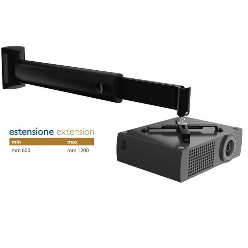 Può essere facilmente istallata a parete o a muro e sostiene proiettori fino a 15 Kg. e di facile installazione. La piastra universale può essere ruotata di 360° ed inclinata di circa 20°. Il braccio della staffa può essere regolato da 600 a 1200mm.