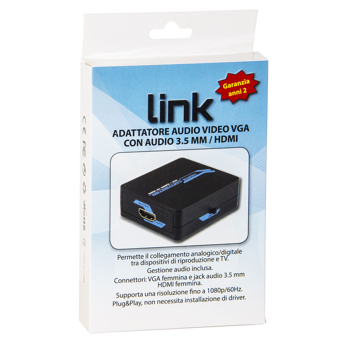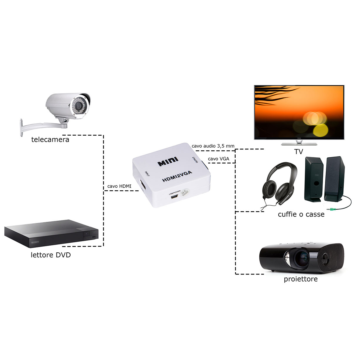 Permette quindi il collegamento di una telecamera, lettore DVD, lettore Blu-ray HDMI a un monitor o proiettore VGA. Gestione audio inclusa.