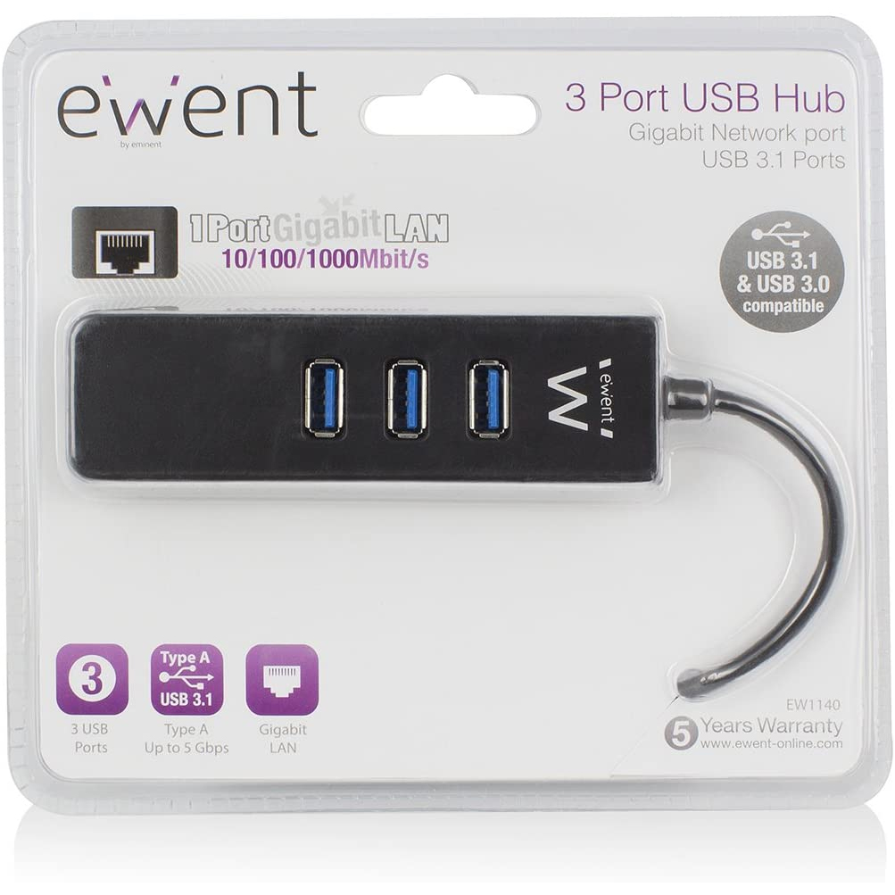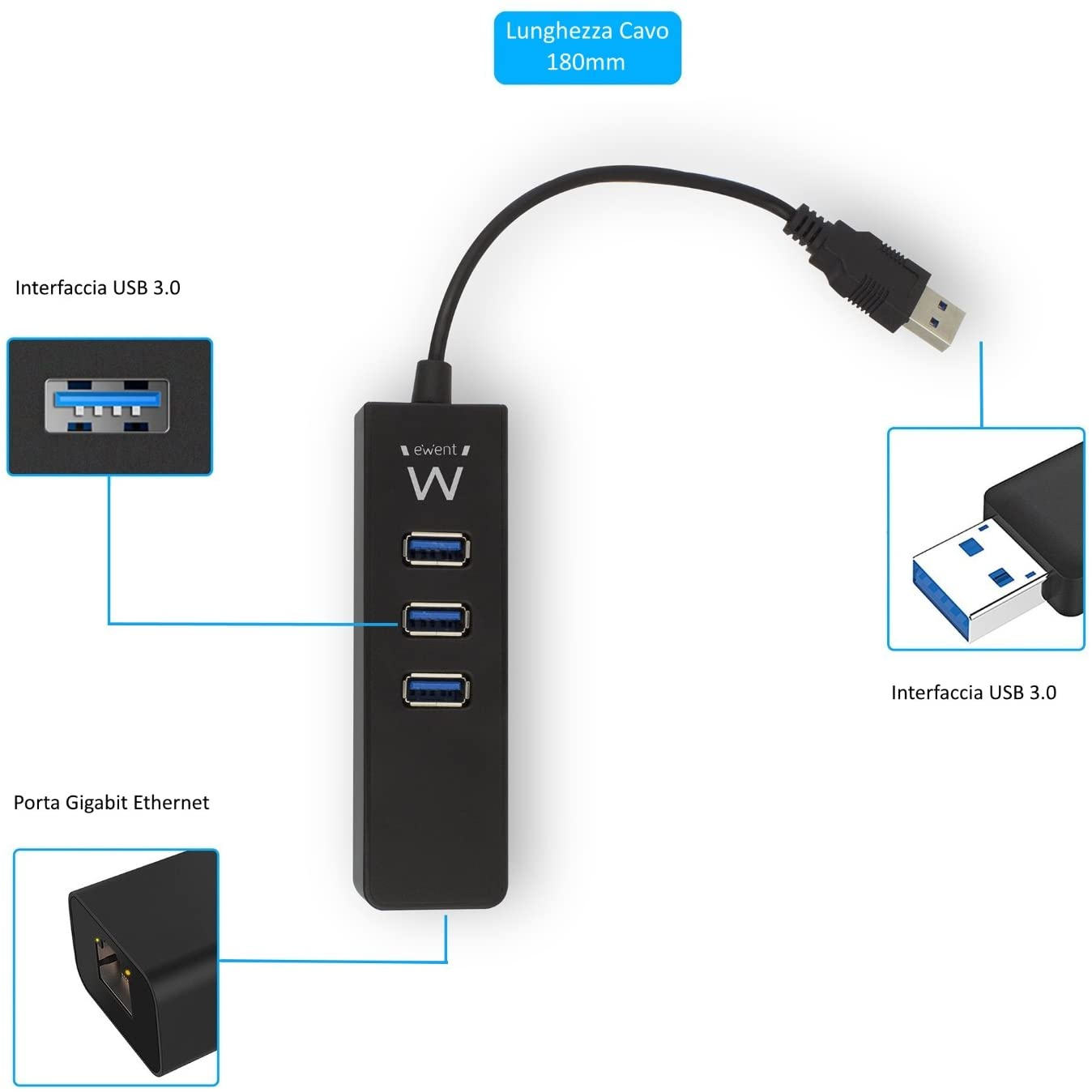 - ADATTATORE RETE USB/LAN (USB Type-A a ETHERNET Gigabit)+ HUB 3 PORTE USB 3.1 EWENT EW1140