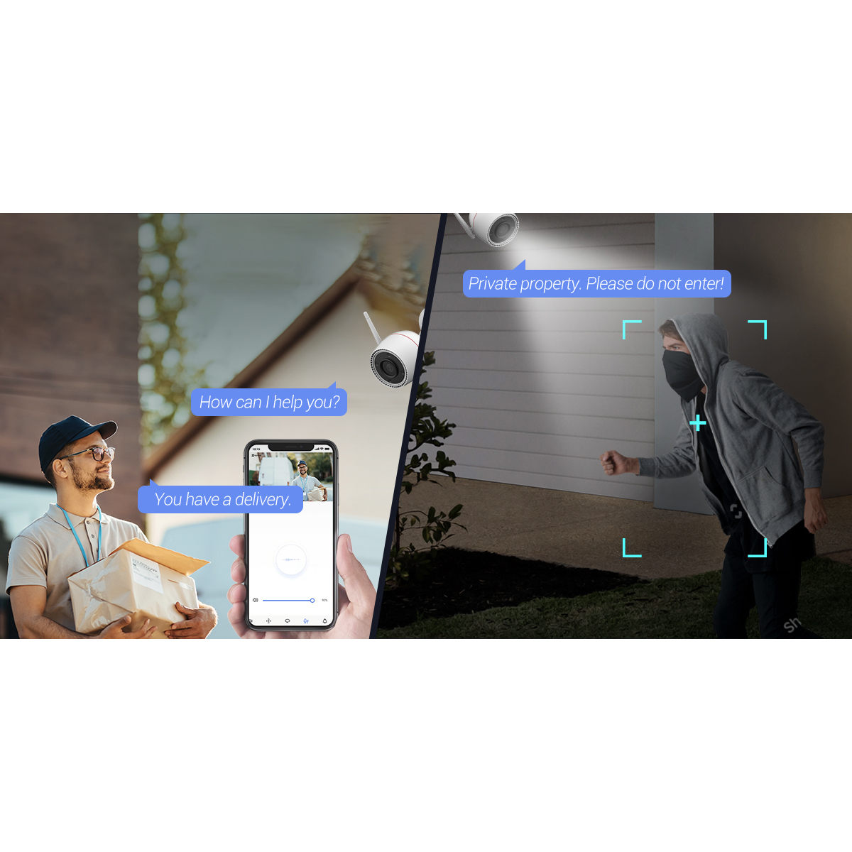 - Una guardia vigile che lavora 24 ore su 24 La telecamera H3c 2K si integra con la tanto apprezzata funzione di difesa attiva di EZVIZ in modo da garantire una protezione aggiuntiva. Una volta rilevati degli intrusi, la telecamera avvia una sirena e attiva i due faretti lampeggianti come deterrente.