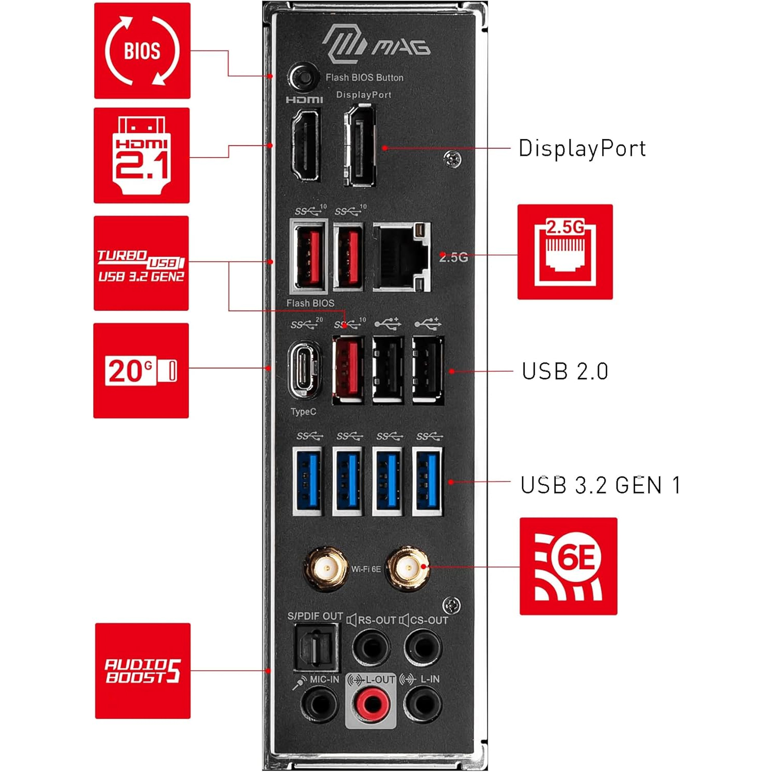 - CONNETTIVIT WI-FI 6E - L'hardware di rete include Wi-Fi 6E con Bluetooth 5.3 e LAN da 2.5Gbps; le porte posteriori comprendono USB 3.2 Gen 2x2 Type-C (20Gbps), HDMI 2.1 e audio ad alte prestazioni 7.1 con Audio Boost 5 (supporta l'uscita S/PDIF).