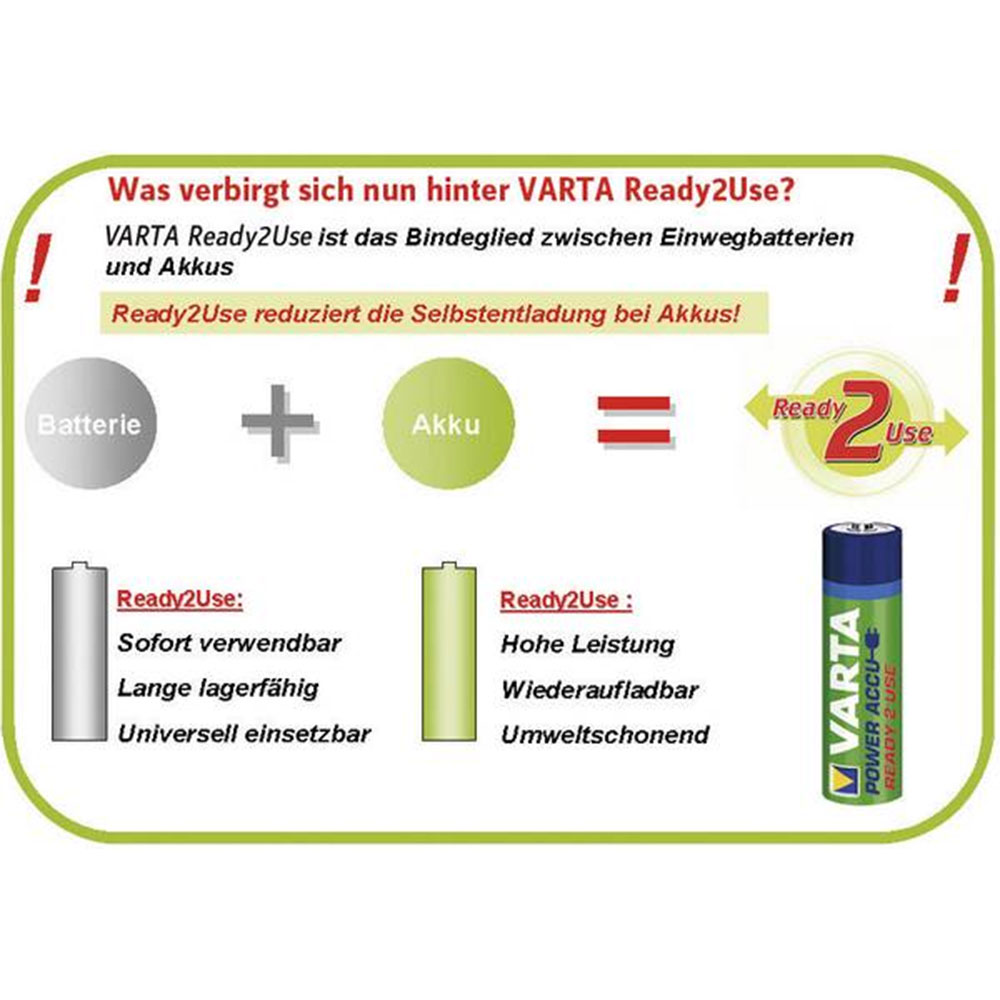 Già cariche nella confezione, possono venire utilizzate immediatamente. Gli accumulatori tradizionali perdono da soli tramite lo stoccaggio una buona parte della loro capacità molto velocemente. VARTA Ready2Use riduce al minimo questo problema. Una volta caricati, questi innovativi accumulatori dimostrano una capacità pari all'80% dell'originale dopo un anno di stoccaggio. Questi accumulatori non richiedono alcun caricatore speciale e sono adatti per tutti i tipi di impiego. Dall'orologio da parete con basso consumo di corrente fino alla telecamera digitale a elevatissimo consumo di corrente, Ready2Use è una soluzione energetica affidabile.