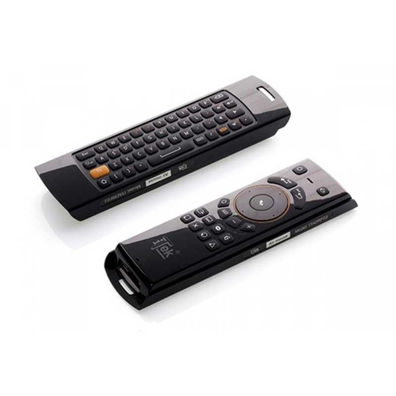 Composto di plastica nera lucida di buona fattura, da un lato è composto da una tastiera qwerty di ottima fattura con tasti ben distanziati tra loro, adatti anche a chi ha dita grandi. Il tasto arancione Fn, ben visibile, è utile per usare le funzioni aggiuntive che si trovano sulla tastiera e che sono evidenziate di arancione in alto a destra. L'altro lato invece, troviamo una serie di tasti utili per accedere alle funzioni collegate al dispositivo, come il televisore oppure ad un media player. Anche qui i tasti sono di ottima fattura. In alto troveremo una finestra semitrasparente dove si intravede il led per la comunicazione, mentre in basso abbiamo la micro usb per la ricarica. Sul fianco sinistro troveremo un led rosso che si illumina ad ogni tasto per l'avvenuta conferma. (escluso quando utilizziamo la qwerty)