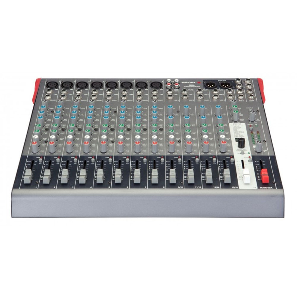 Il nuovo Mi16 offre 8 canali MIC/LINE e 4 canali STEREO/LINE che, insieme a 2 mandate monitor e al DSP PROFEX a 24bit con 256 effetti di elevata qualità, rendono questo mixer compatto in grado di essere utilizzato per mixare una band completa con suono pulito e accurato.