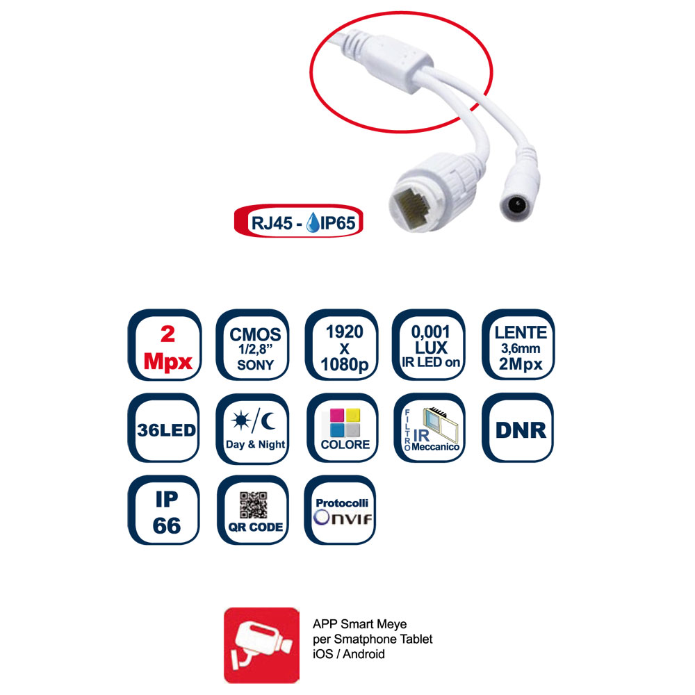 Telecamera IP da esterno o interno a colori, Day-Night,Telecamera di alta qualità, tenuta stagna IP66, 2Mpx 1080P. Lente fissa Ottica 3.6 mm. Funziona con sistemi digitali IP .
