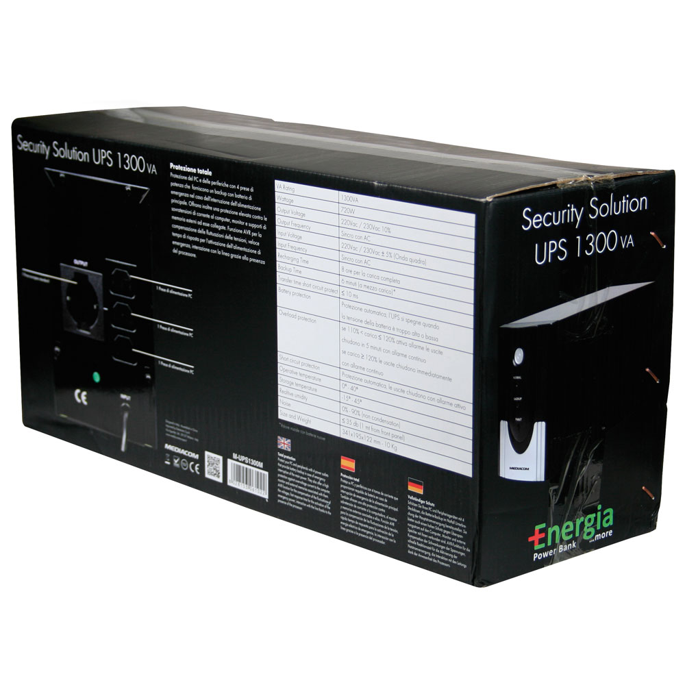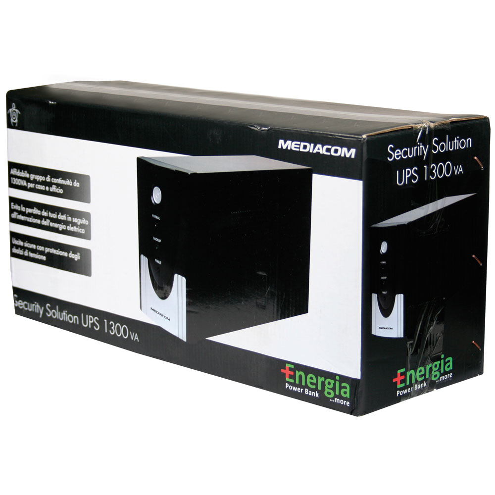 MEDIACOM M-UPS1300M Security UPS 1300 - UPS - 1300 VA - 4 Connettori uscita - Dimensioni (LxPxH) 12.2 cm x 34 cm x 19.5 cm . 6 min A mezzo carico .
