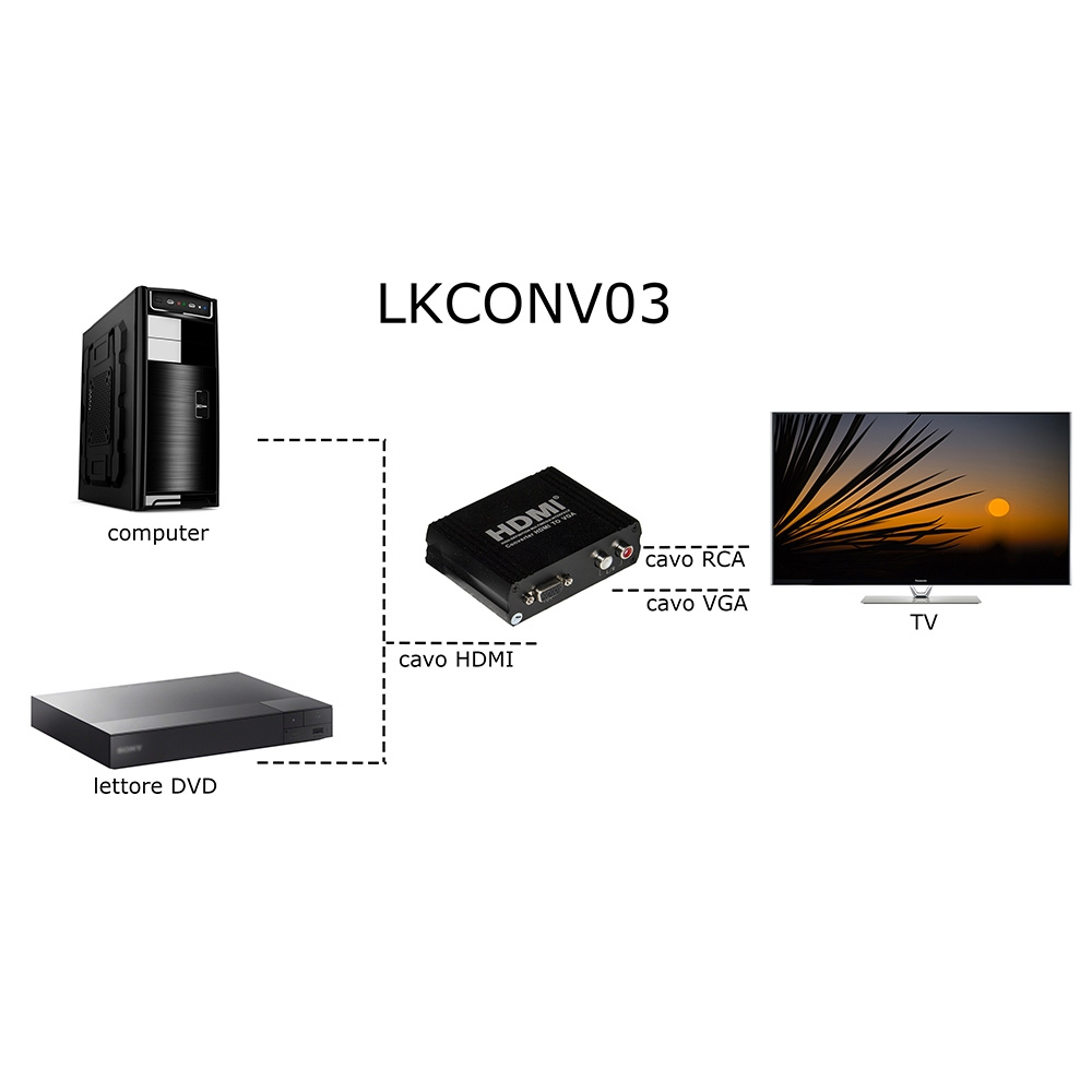 Con questo adattatore si può collegare un dispositivo HDMI come un PC, notebook, lettore DVD, Blu-Ray ecc., a un video o TV con connettore VGA, con audio RCA.
