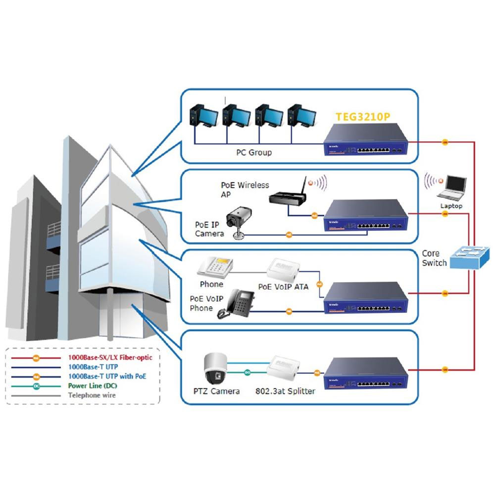 Fornisce elettricità e trasmette dati allo stesso tempo ad access point, IP camera o telefoni IP tramite cavo Cat. 5 a coppie twistate. Inoltre, garantisce un sistema di protezione più sicuro e un sistema QoS migliorato, multiple caratteristiche VLAN e maggiore disponibilità di manutenzione.