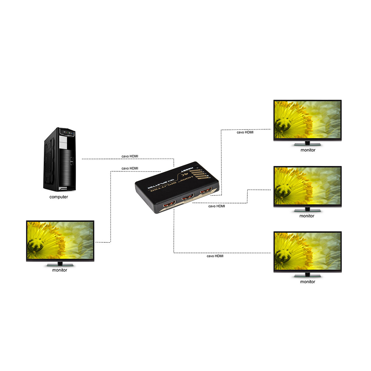 Questo splitter HDMI, consente di collegare 4 monitor/display HDMI a un'unica sorgente video HDMI, Risoluzione full 3D e 4K @ 30Hz (30MHz).