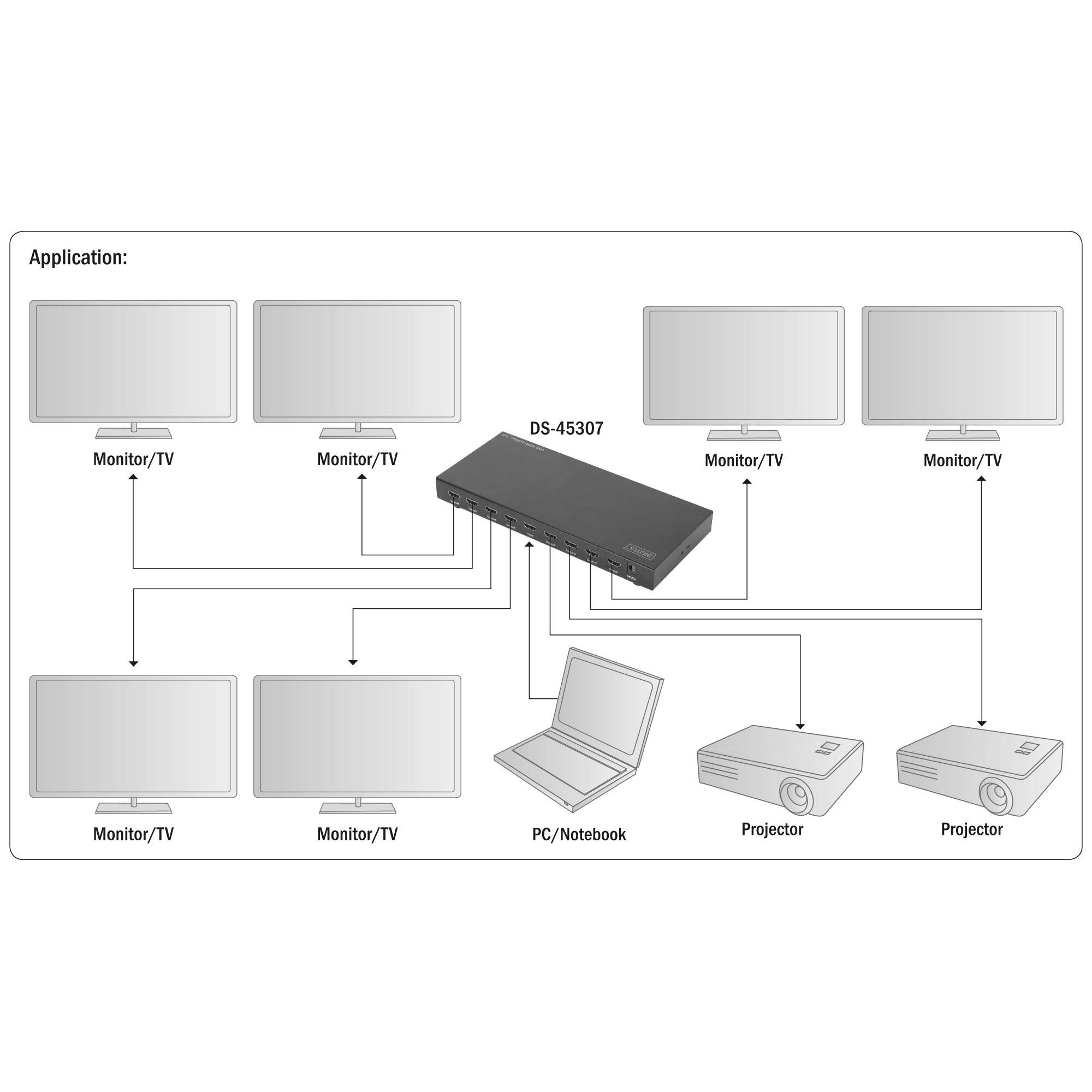 Con lo splitter HDMI 8 porte UHD Digitus è possibile distribuire un segnale video a massimo otto dispositivi di riproduzione (TV, display, monitor, proiettori, ecc.). Supporta la migliore risoluzione UHD (4K2K, 60 Hz). Offre la soluzione ideale per le applicazioni commerciali come per esempio presentazioni video o esposizione di prodotti (stanze di uffici/negozi, stand espositivi, vetrine, sale d'attesa, ristoranti, ecc.). Lo splitter è a cascata a uno stato, possono essere collegati fino a altri 8 Splitter HDMI (8 porte), per distribuire il segnale a un massimo di 64 riproduttori.