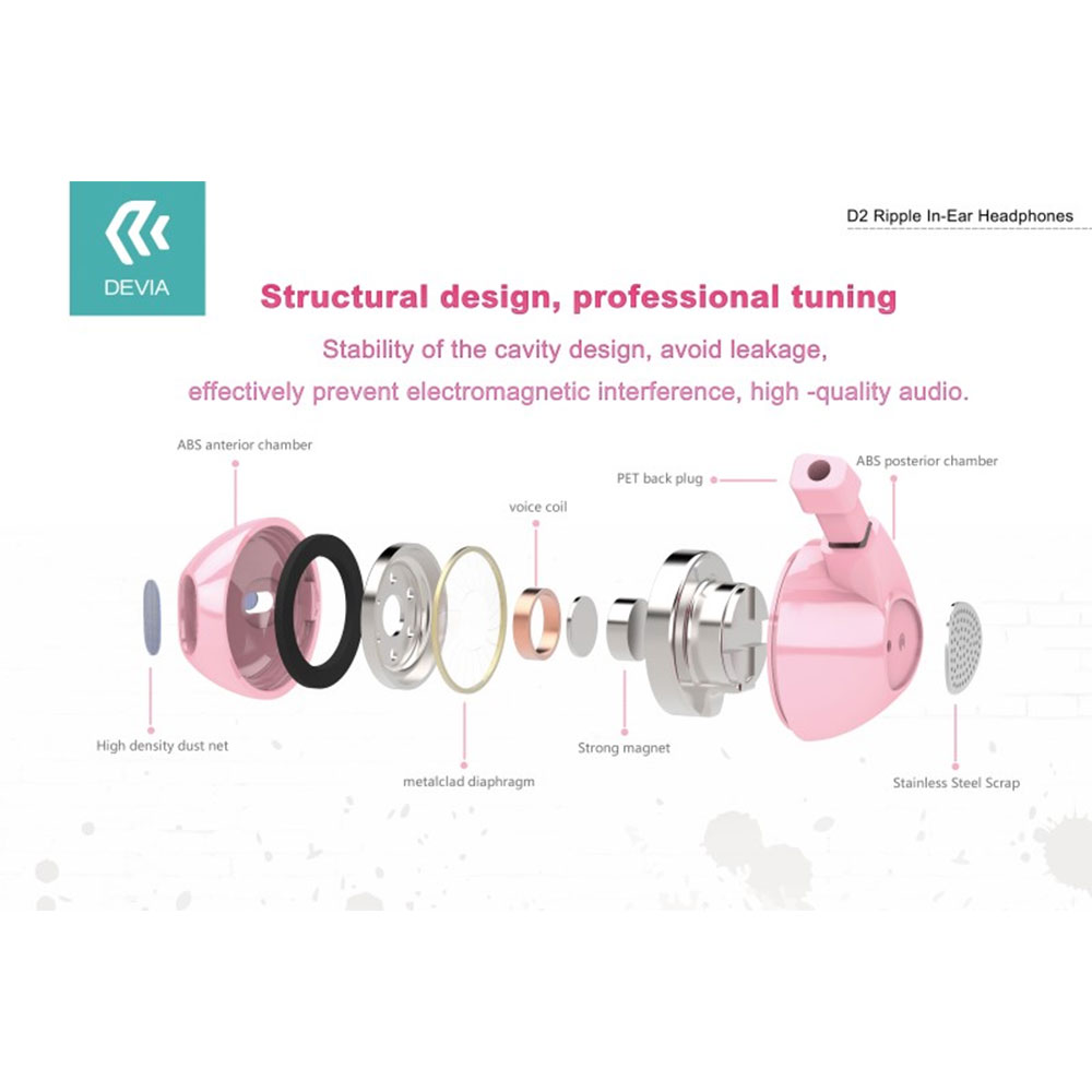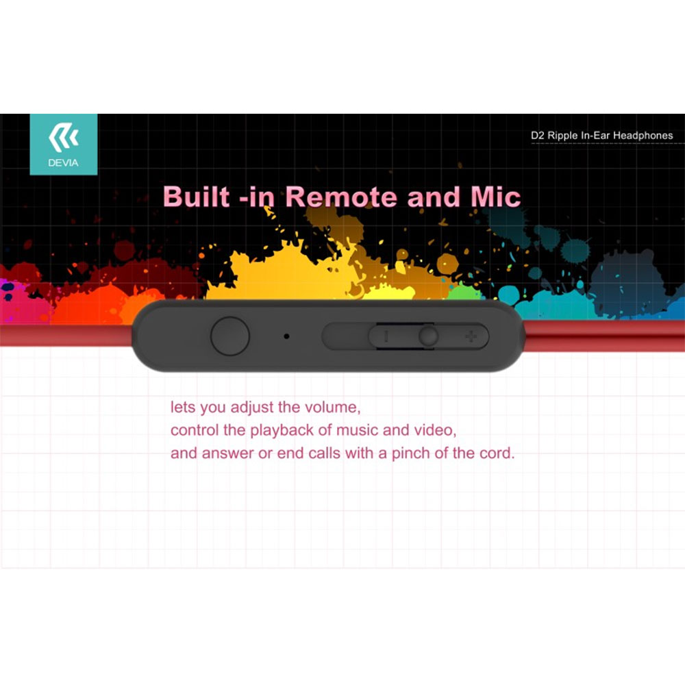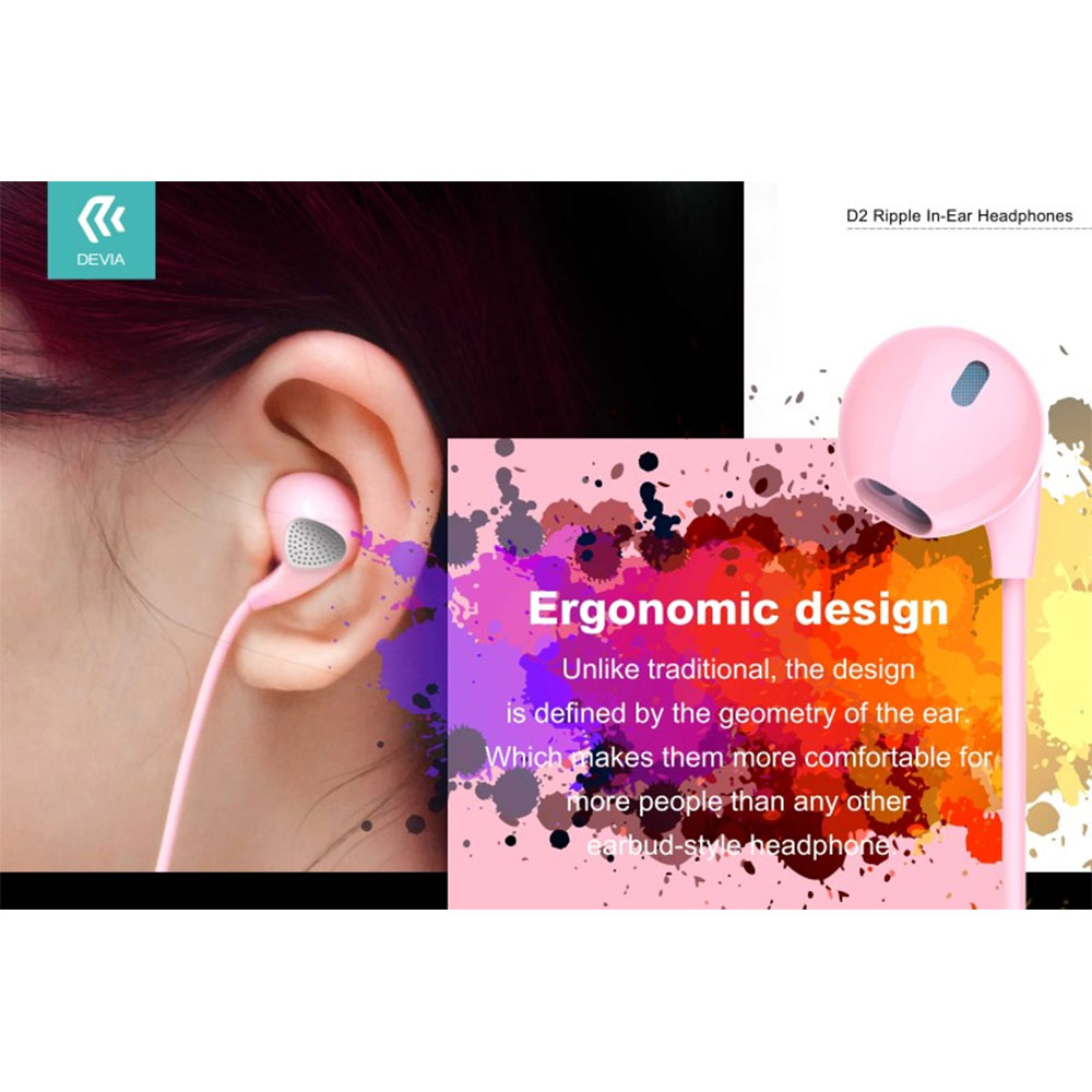 Devia D2 Ripple con telecomando e microfono diversamente dai tradizionali auricolari circolari, il design degli D2 Ripple si ispira alla geometria dell' orecchio. che li rende più confortevole per più persone di qualsiasi altra earbud-style cuffie.