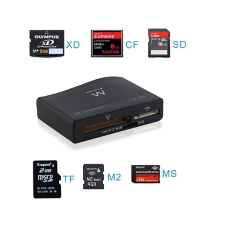 Il lettore di schede USB 3.0 Ewent è in grado di supportare le schede di memoria più usate ;SD, SDHC e l'ultima generazione di schede SDXC.