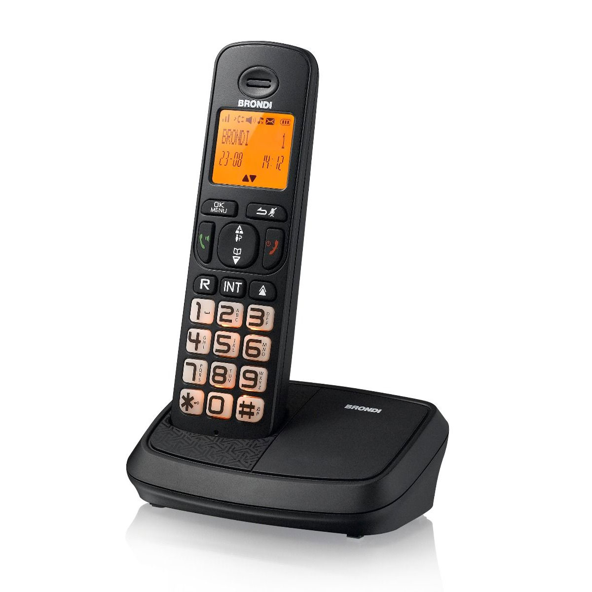 Telefono cordless Brondi rich eco dect con display e tasti grandi retroilluminati, con funzione vivavoce e 2 memorie dirette configurabili su tasto 1 e tasto 2.
