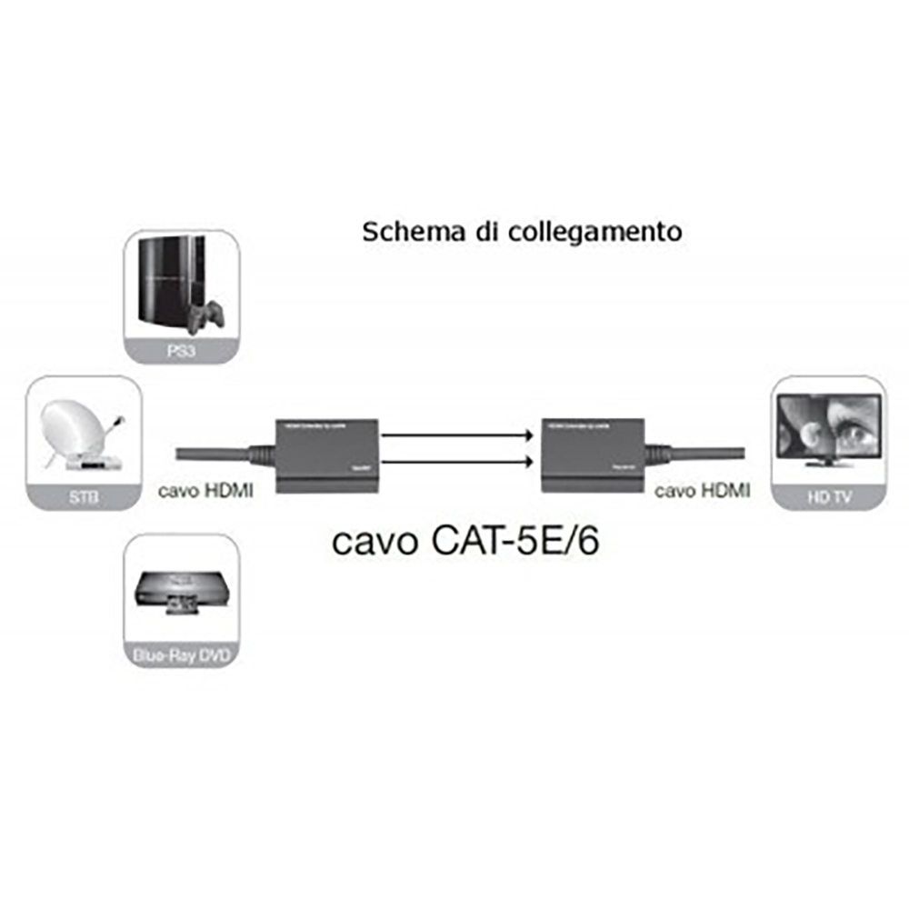 Basterà connettere il trasmettitore con un cavo HDMI ad Alta velocità alla sorgente HDMI e, sempre con un cavo HDMI ad Alta velocità, il ricevitore alla TV. Il trasmettitore e il ricevitore sono connessi tramite un unico cavo UTP della lunghezza massima di 60 metri. Sia trasmettitore che il ricevitore sono dotati di un adattatori AC aggiuntivi.