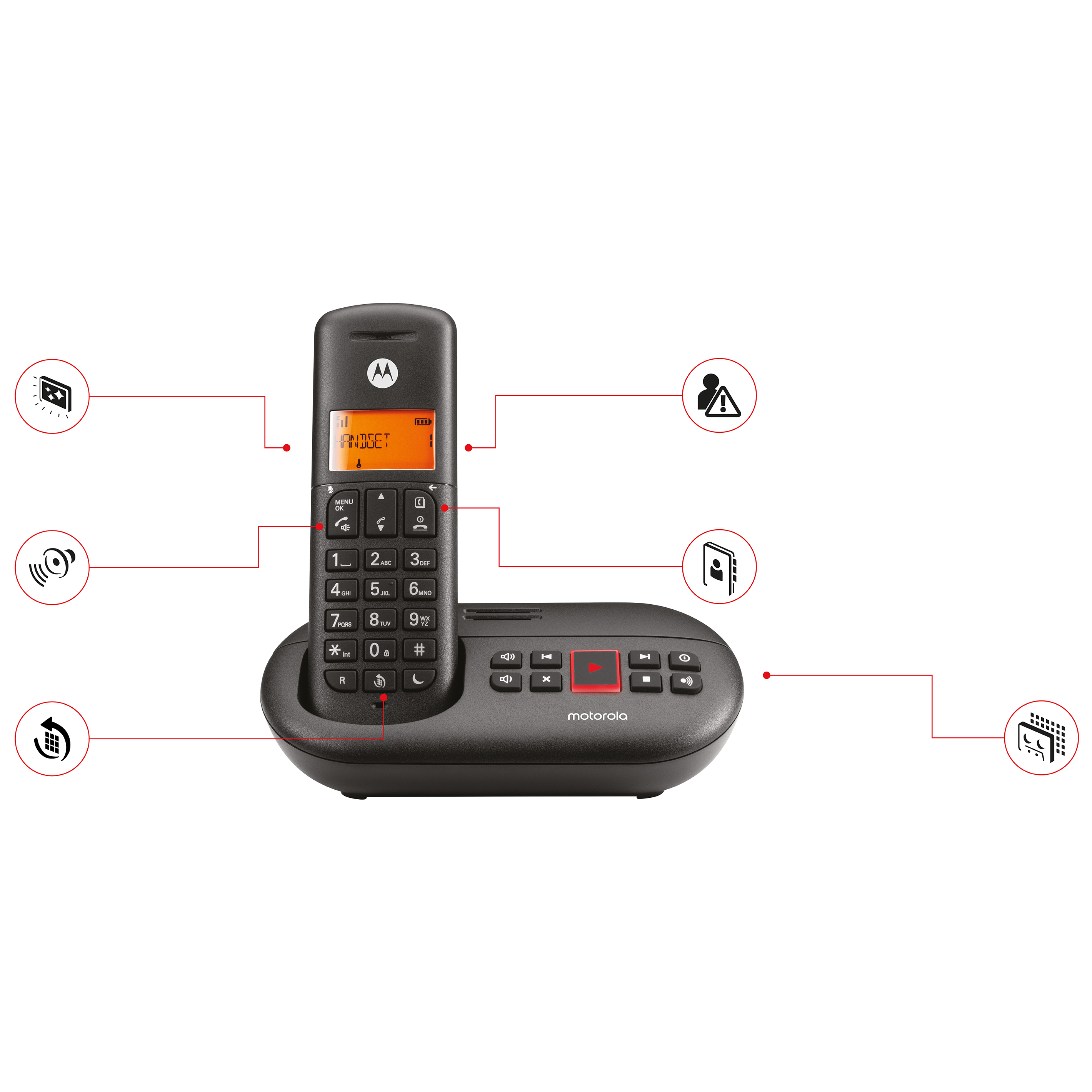 Telefono cordless Motorola E211 - Display LCD retroilluminato - Suono nitido - Rubrica 50 num. - Dect - Segreteria telefonica - Nero