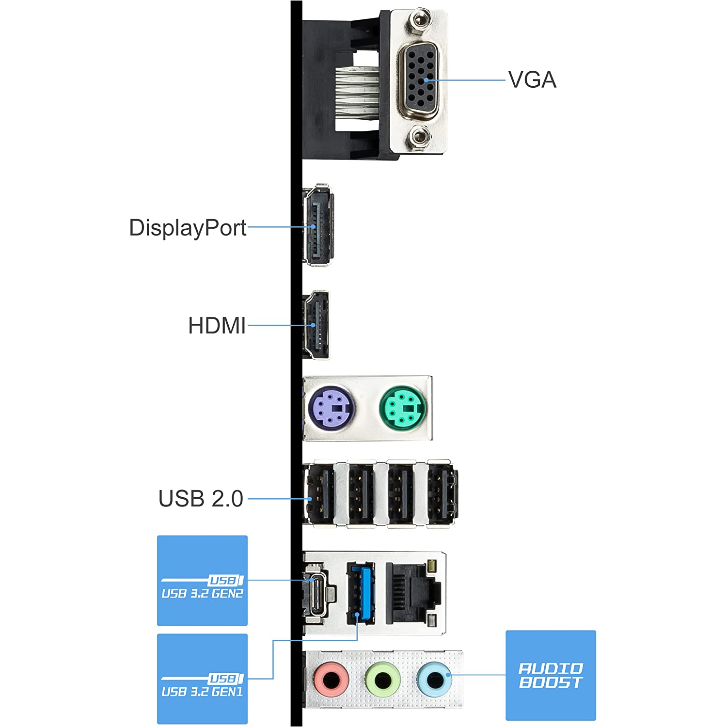 - L'hardware di rete include un controller LAN 1 Gbps; Le porte posteriori includono 1 x USB 3.2 Gen 2 Type-C (10 Gbps), 1 x USB 3.2 Gen 1 Type-A (5 Gb/s), DP 1.4, HDMI 4K/30Hz, porta VGA legacy & Audio HD 7.1 con Audio Boost