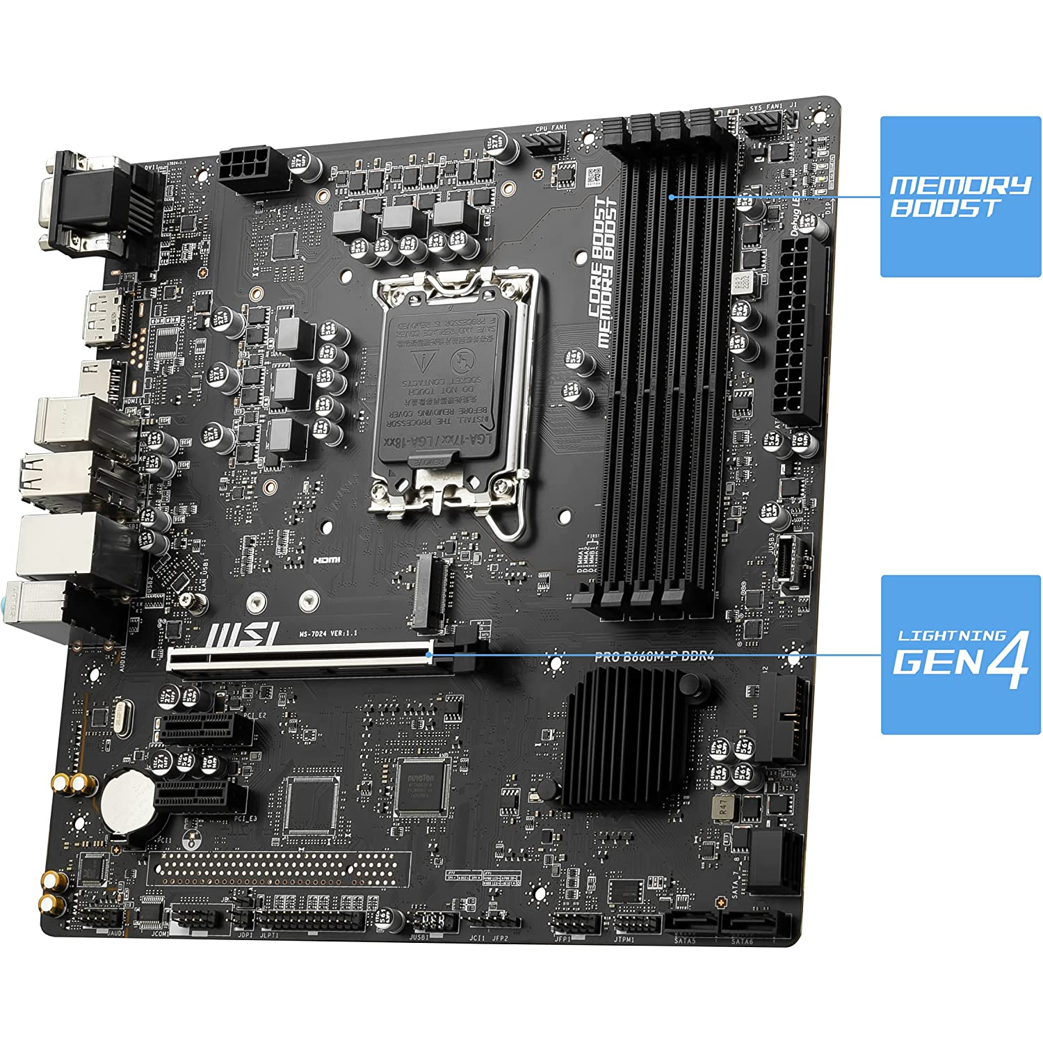 PRO B660M-P DDR4 (mATX) utilizza un VRM di design completamente digitale per il chipset Intel B660 (LGA 1700, 12th Gen Core ready) con architettura Core Boost per le elevate esigenze delle CPU multicore