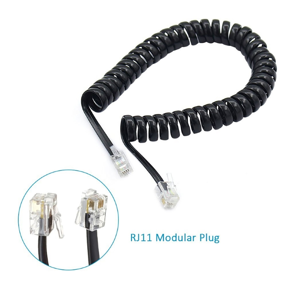 Cavo telefonico spiralato adatto al collegamento tra telefono e cornetta con 2 connettori RJ10 4 posizioni, 4 contatti.