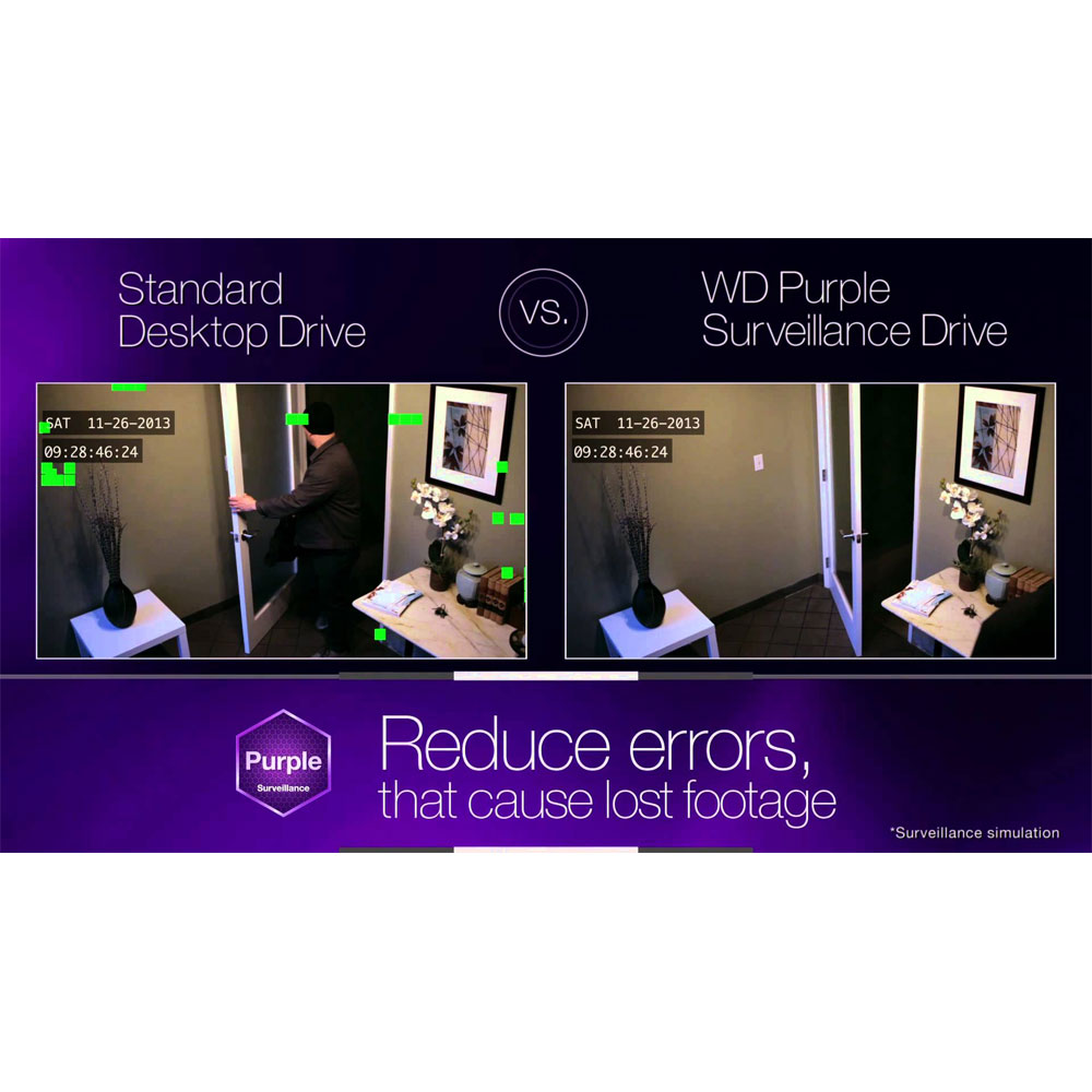 Lo storage per la videosorveglianza WD Purple è stato testato per assicurarne la compatibilità con tutta una serie di sistemi di sicurezza. Queste unità sono state progettate per sostituire le unità desktop standard non sviluppate per l'ambiente complesso della videosorveglianza ad alta definizione e sempre in funzione (24x7). Le unità desktop sono costruite per rimanere in funzione solo per brevi intervalli e non per sostenere le elevate oscillazioni termiche e le variazioni caratteristiche di una tipica applicazione di videosorveglianza.