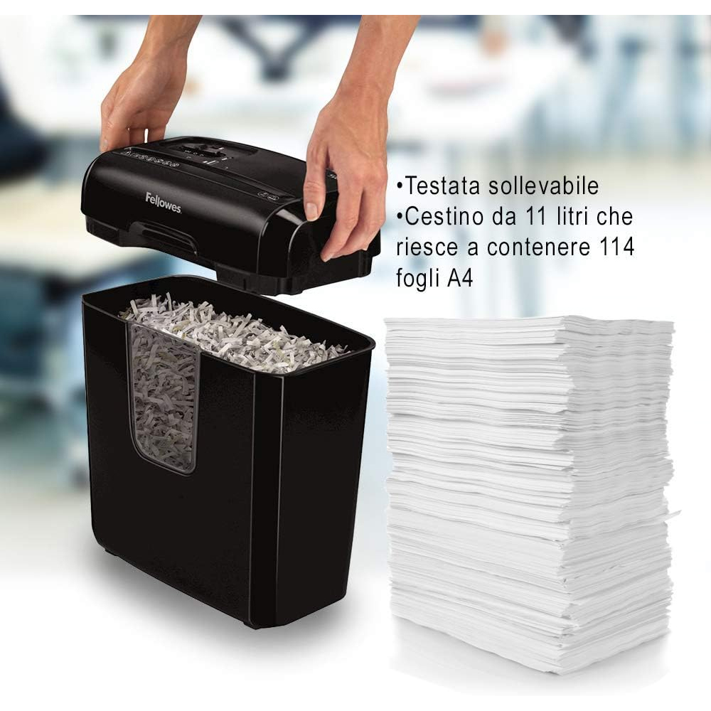 Tipologia di taglio: Frammento - Livello di Sicurezza: DIN 4 - Taglio larghezza: 4x35 mm - Capacità cestino:11 lt Capacità di taglio: 6 fogli - Accetta anche: punti metallici, graffette e carte di credito.
