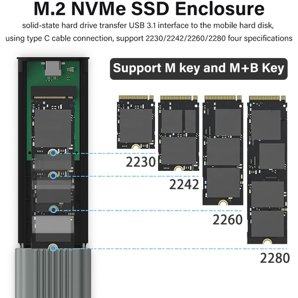 Box esterno per SSD M.2 NVMe/PCIe con lenclosure SSD portatile USB-C 3.2 Gen2 M.2 NVMe/PCIe in robusto alluminio. SSD NVMe e PCIe: Adatto per SSD M.2 NVMe e PCIe, la dimensione dell'SSD è 2230/2242/2260/2280.