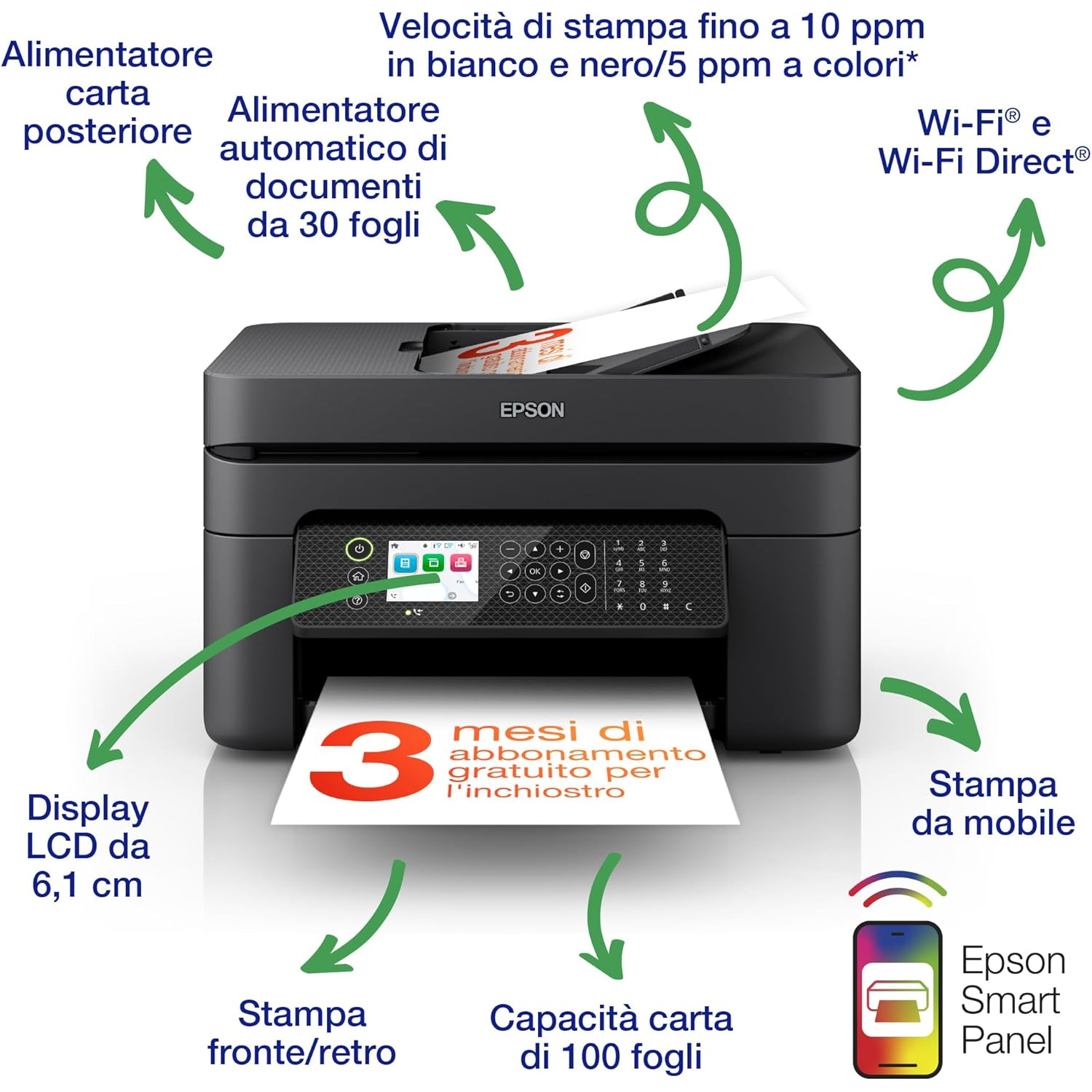 Elegante, compatto e facile da usare, questo multifunzione inkjet riduce sprechi e costi grazie alla stampa A4 fronte/retro e all'uso di convenienti cartucce di inchiostro separate. Velocizza la copia, la scansione e l'invio di fax di più pagine con l'alimentatore automatico di documenti, la tecnologia Scan-to-Cloud e l'ampio display LCD da 6,1 cm. Potrai stampare facilmente ovunque ti trovi con Wi-Fi, Wi-Fi Direct, Epson Connect e Apple AirPrint.