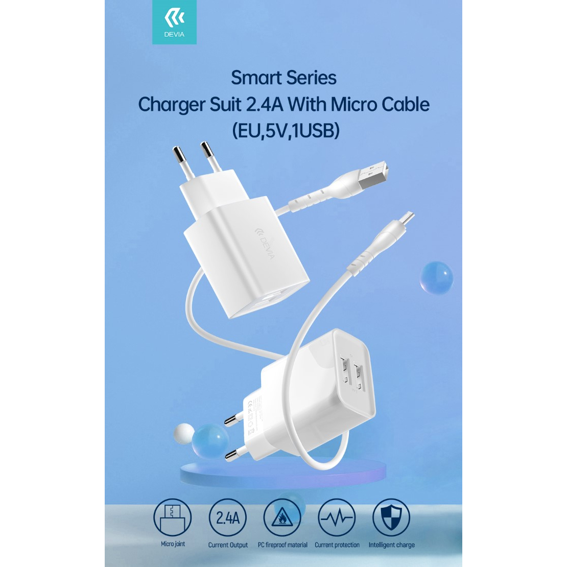 Suit Carica Batteria 2USB 5V/2.4A (12W) e Cavo Dati Per Smartphone Android " Micro USB" 1mt - KIT COLORE BIANCO