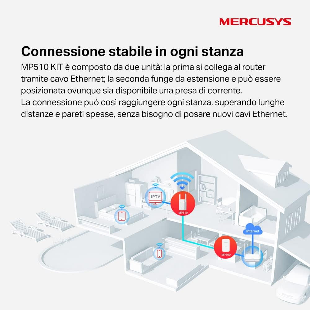 Powerline Kit Homeplug AV2 Trasmissione dati stabile e veloce fino a 1000Mbps sull'impianto elettrico pre-esistente.