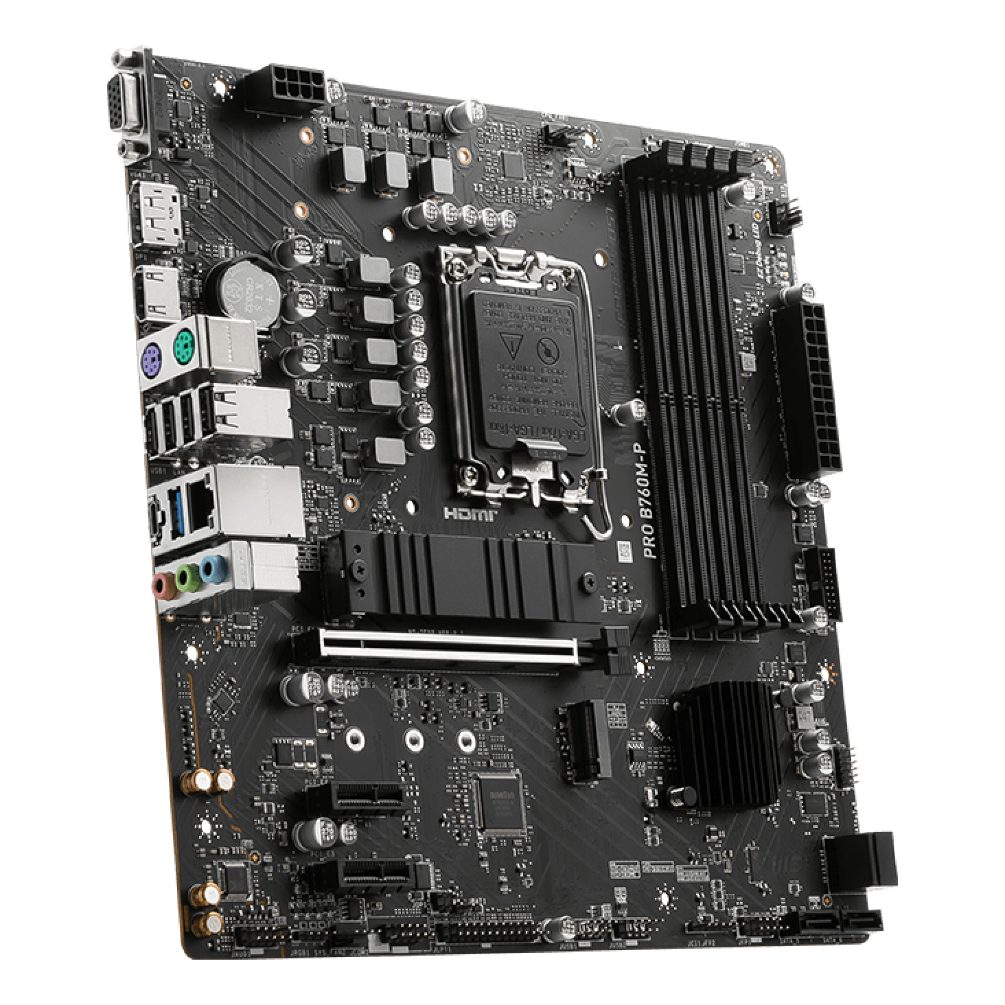 MSI PRO B760M-P. Produttore processore: Intel, Presa per processore: LGA 1700, Processori compatibili: Intel Celeron , Intel Pentium Gold. Tipi di memoria supportati: DDR5-SDRAM, RAM massima supportata: 192 GB, Compatibilità ECC: Non-ECC. Interfacce dell'unità di archiviazione supportate: SATA III, Tipi di unità di archiviazione supportate: HDD & SSD, Livelli RAID: 0, 1, 5, 10. Tipo di interfaccia Ethernet: Gigabit Ethernet, Controller LAN: Realtek RTL8111H. Componente per: PC, Fattore di forma scheda madre: micro ATX, Famiglia di chipset per scheda madre: Intel
